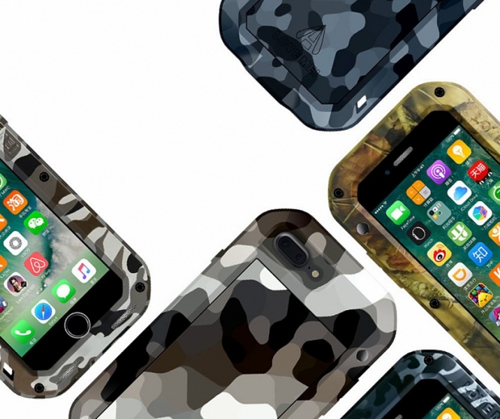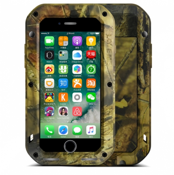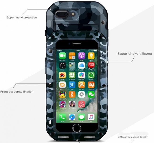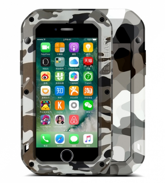 Ударопрочный чехол Love Mei Camo Series для iPhone 7 Love Mei Camo Series — это противоударный пылезащищенный чехол для iPhone 7. С ним ваш смартфон будет максимально защищен от любых непредвиденных ситуаций. Чехол состоит из таких частей, как передний бампер, противоударное стекло, задняя подкладка, задняя крышка и задний бампер. Все это закрепляется с помощью 6 винтов и гарантирует непревзойденную защиту смартфона от последствий падений, сколов, царапин, пыли и брызг. Чехол изготовлен из высококачественного алюминия — легкого, но прочного материала. Он также оборудован противоударным стеклом, которое способно выдержать падение с 1,8-метровой высоты. Все разъемы в чехле закрываются силиконовыми заглушками, что препятствует попаданию в них пыли, при этом вы всегда можете получить быстрый доступ к органам управления. Камера защищена специальным силиконовым ободом.