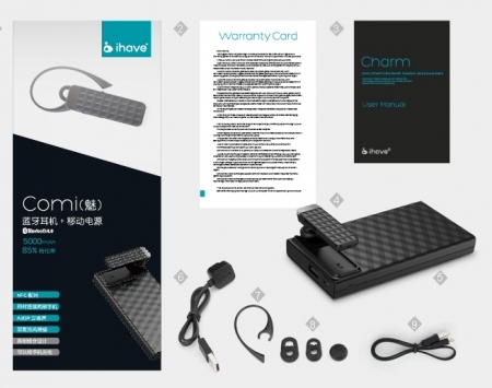 - Входящий в комплект аккумулятор емкостью 5000mAh имеет специальную базу, предназначенную для зарядки гарнитуры iHave Comi (Charm). Кроме того, с его помощью можно заряжать практически любые мобильные устройства, для чего к аккумулятору прилагается соответствующий кабель. На передней панели аккумулятора расположен четырехуровенный индикатор заряда;