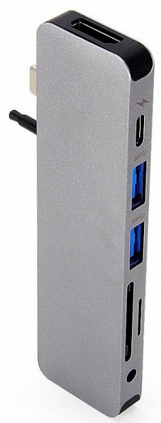 USB-хаб HyperDrive Solo GN21D для MacBook Hyper HyperDrive Solo представляет собой функциональное устройство, при помощи которого можно значительно расширить количество интерфейсов в ноутбуке. Модель подключается при помощи USB-C и имеет 7 различных разъемов. Hyper HyperDrive Solo обладает стильным дизайном, достигнутым благодаря алюминиевому корпусу, что также обеспечивает высокую прочность устройства. Интерфейсы расположены таким образом, чтобы одновременное задействование каждого порта не вызывало трудностей. Модель станет отличным решением для новых моделей ноутбуков, в которых малое количество встроенных портов и имеется разъем USB-C. Hyper HyperDrive Solo позволяет значительно расширить возможности ноутбука, добавив ему 7 различных портов, используя при этом лишь один разъем USB-C. Использование данного разъема гарантирует высокую скорость работы и передачи данных. Концентратор дает возможность подключать внешние мониторы (HDMI), наушники или акустику (mini-jack 3.5mm), карты памяти SD и MicroSD, а также различную периферию (USB 3.1, USB-C).