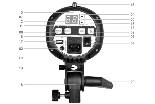 01. Разъем для кабеля питания переменного тока 02. Гнездо для синхрокабеля 03. Кнопка включения 04. Кнопка увеличения параметра 05. Кнопка уменьшения параметра 06. Кнопка выбора режима ведомой вспышки 07. Кнопка управления мощностью пилотного света 08. Звуковой сигнал 09. Кнопка тестовой вспышки 10. ЖК дисплей 11. Индикатор ведомой вспышки 12. Индикатор работы лампы пилотного света 13. Индикатор звукового сигнала 14. Индикатор тестовой вспышки 15. Датчик количества света 16. Предохранитель 17. Разъем для беспроводного управления 18. Установочный кронштейн 19. Отверстие для установки зонта 20. Ручка регулировки угла наклона